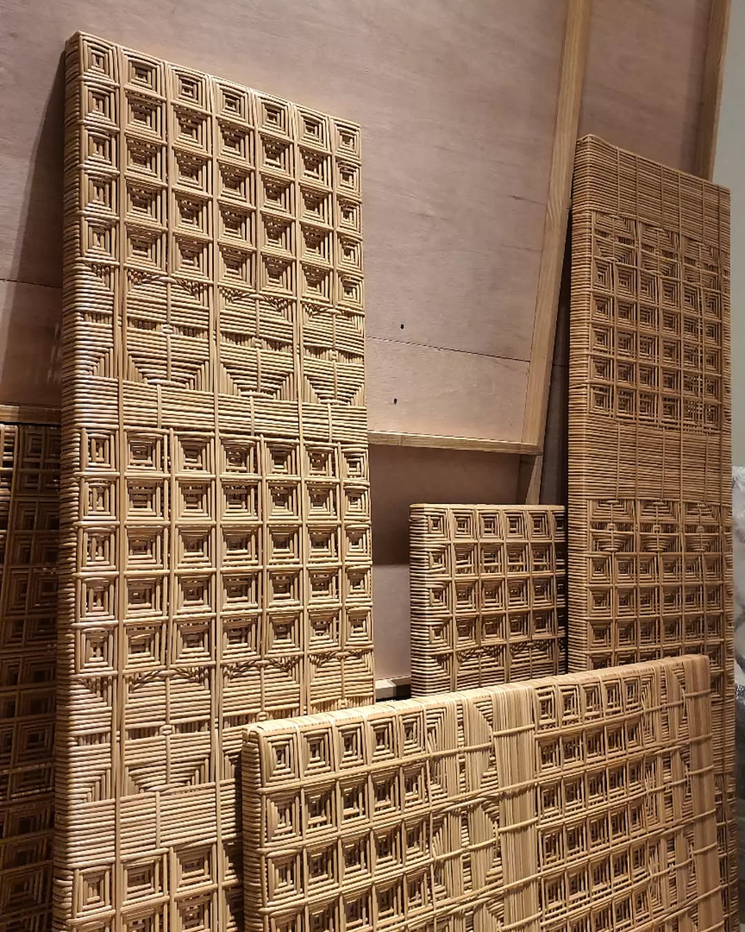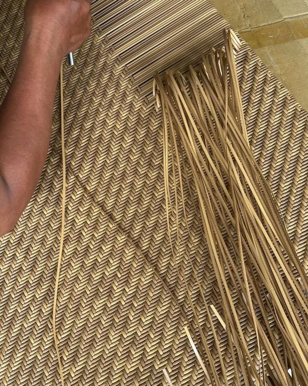 Hand weaving synthetic rattan sheet is the craft of creating a decorative material by manually interweaving flexible strips of synthetic rattan. The direction in which the artisans weave the strips depends primarily on the final pattern or texture to be achieved using adapted basket weaving techniques and specific tools to achieve a roll-like product that can be folded, cut and installed on an aluminium or wooden base to decorate walls or ceilings.